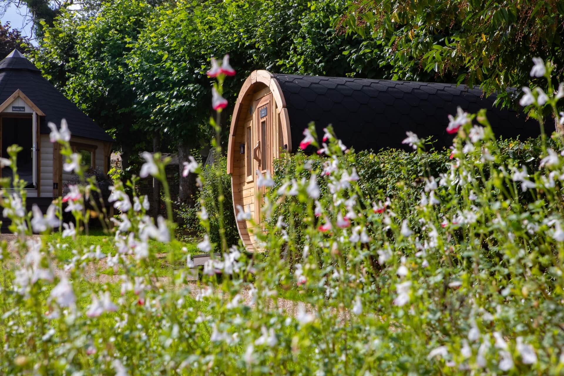 Cozy wooden barrel-shaped cabin and conical hut nestled in green garden with blooming white and pink flowers under large leafy trees