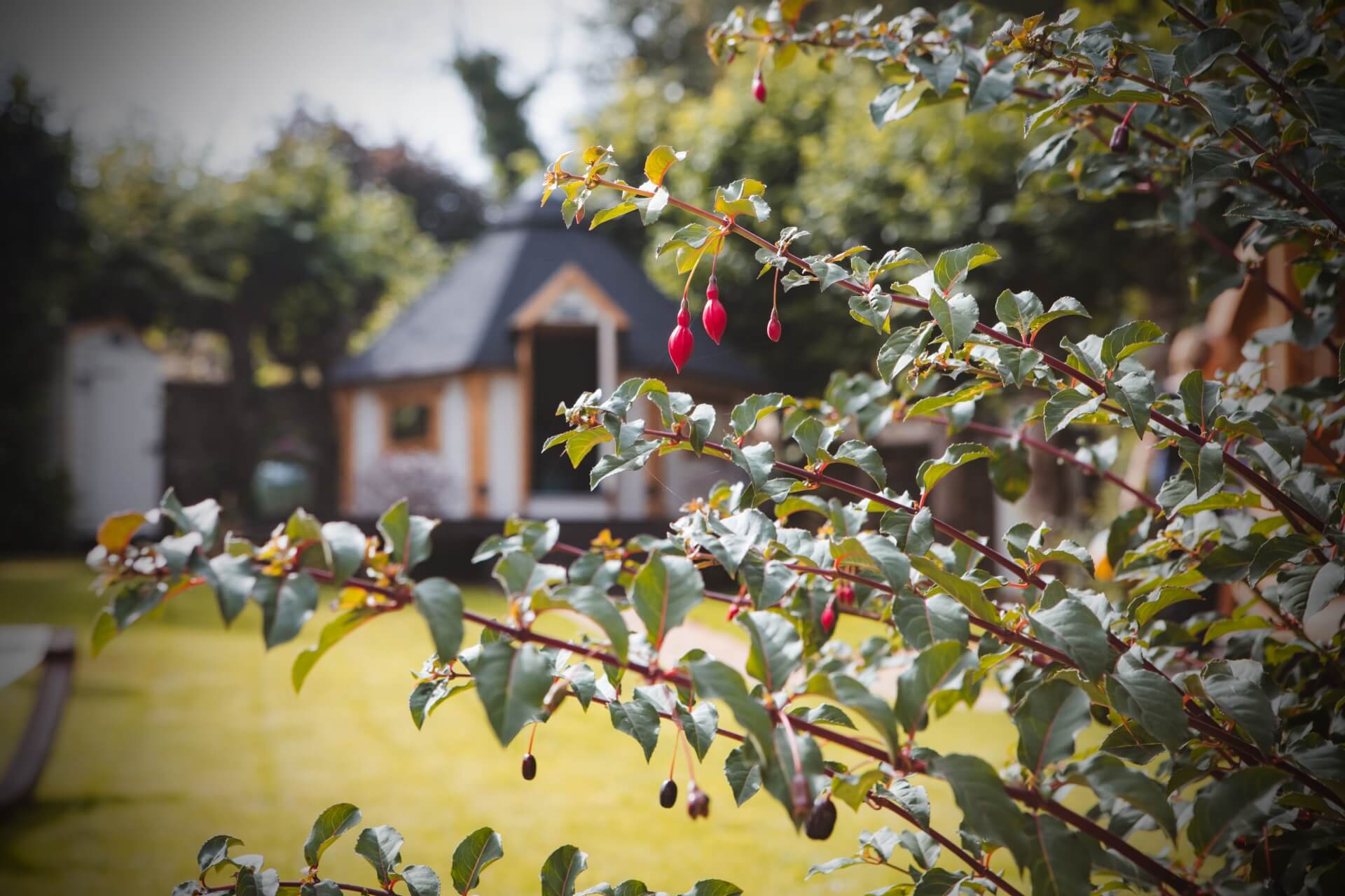 Charming garden with bright green lawn and a small timber-framed building with a dark roof in the background