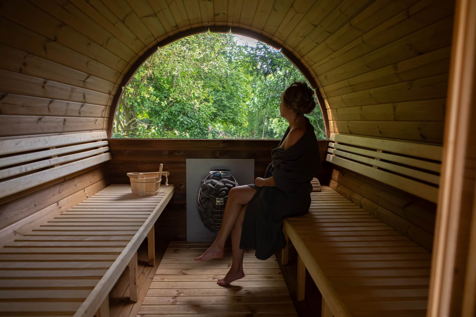 Guest wrapped in towel relaxing inside a wooden barrel sauna with large arched window overlooking lush green trees