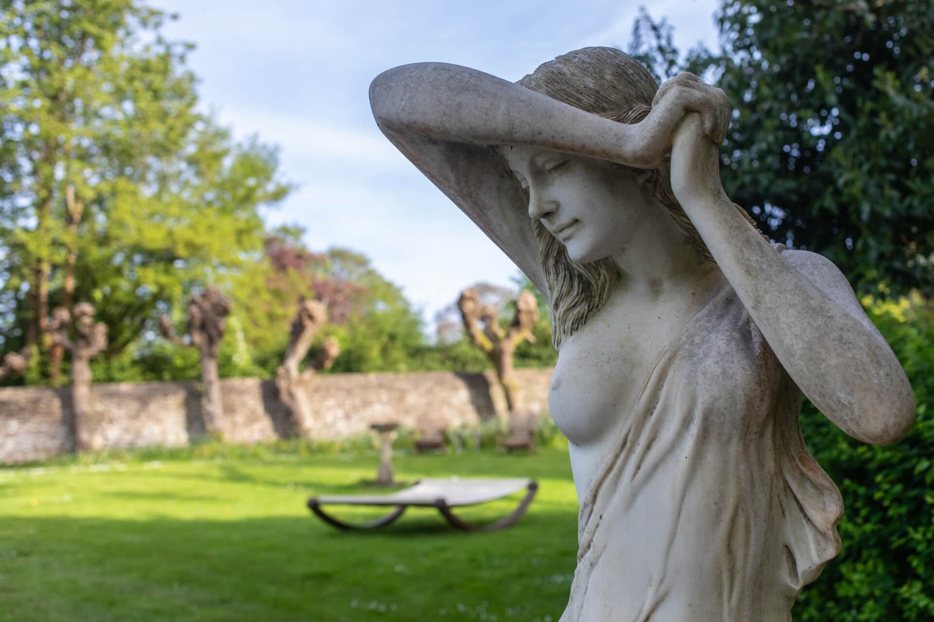 Elegant stone statue of a woman in a lush garden with trimmed trees and stone wall in the background
