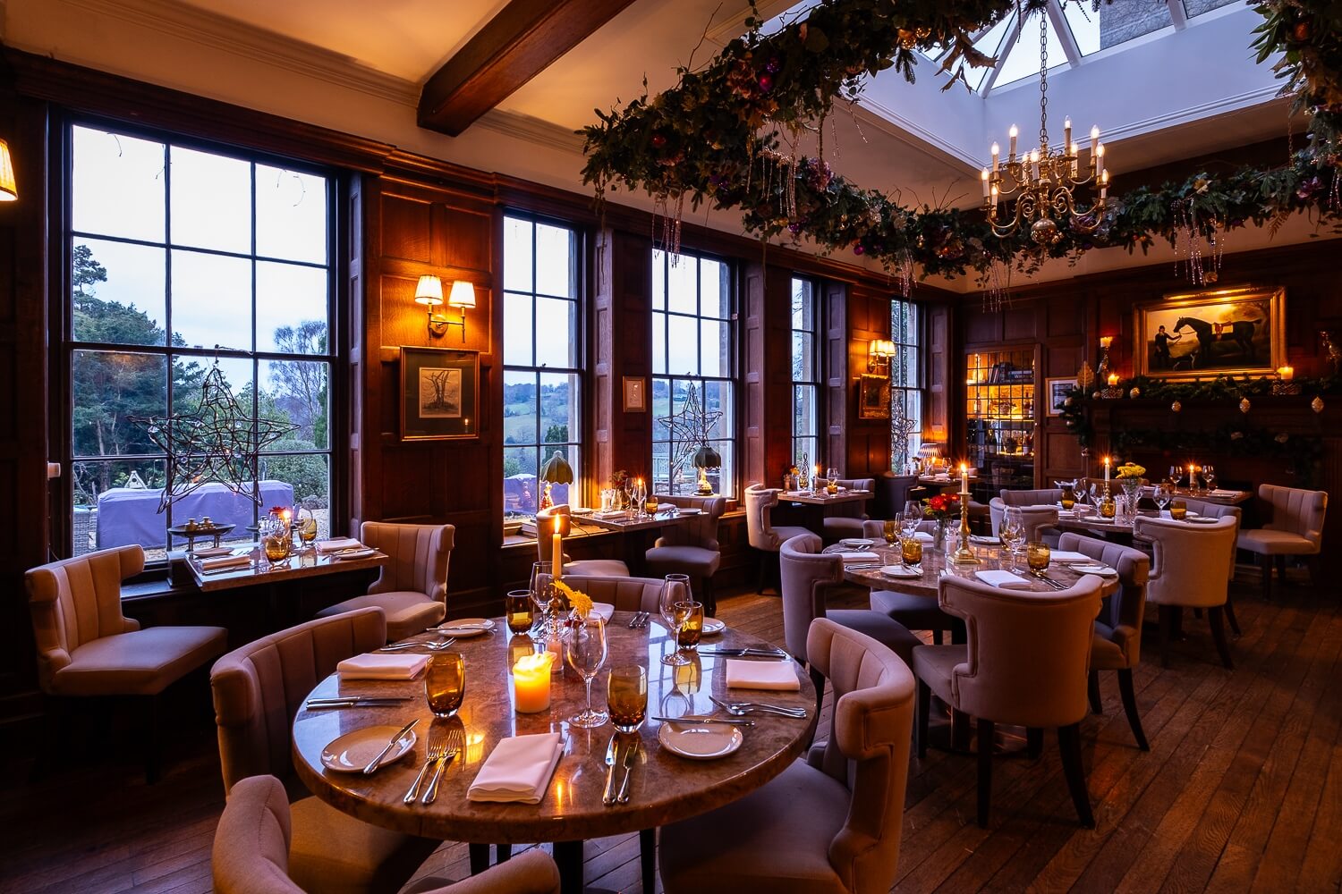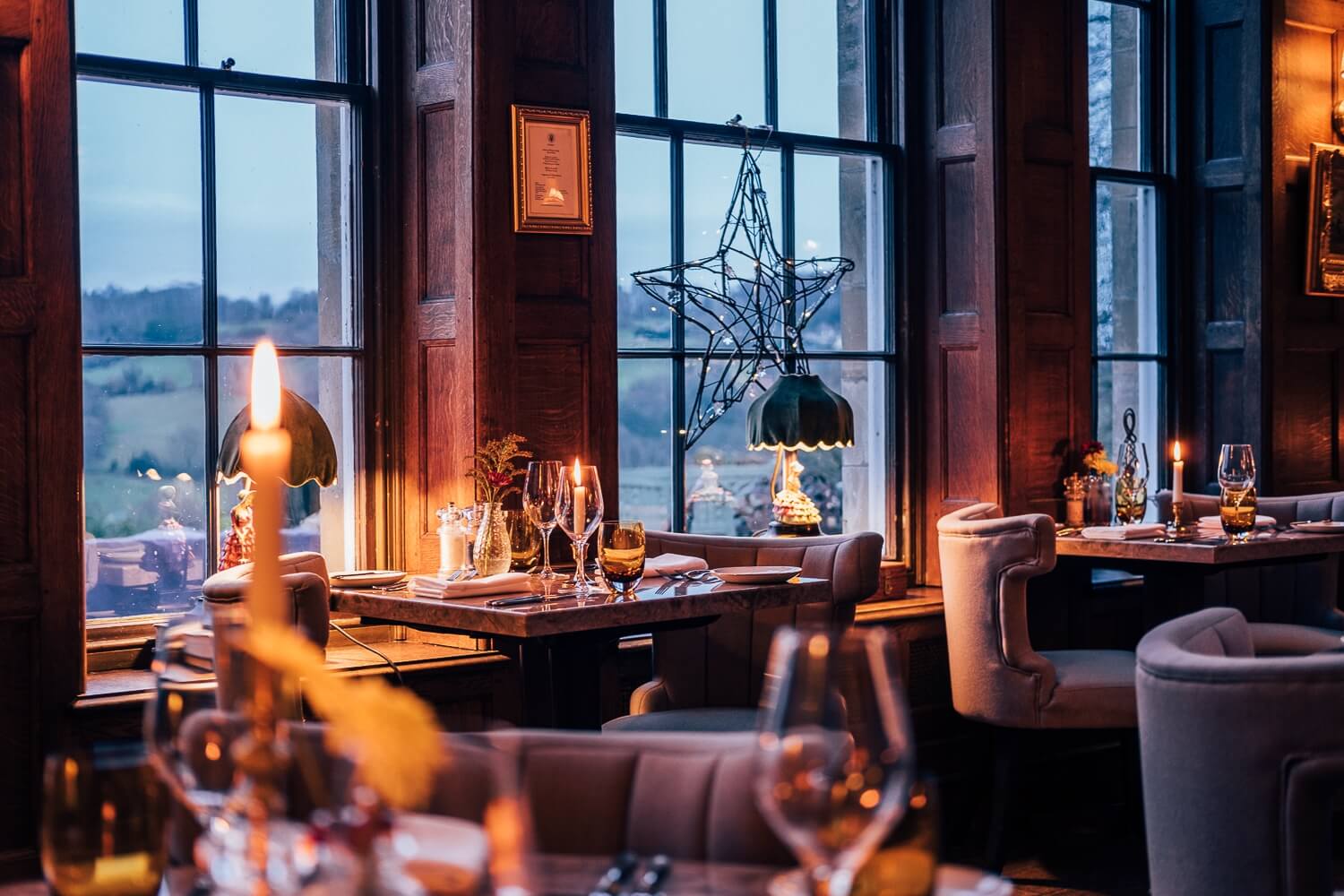 Elegant dining room with plush chairs, candlelit tables, large windows showing scenic countryside, and festive holiday decor with chandelier
