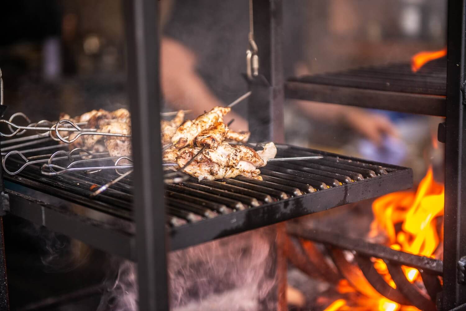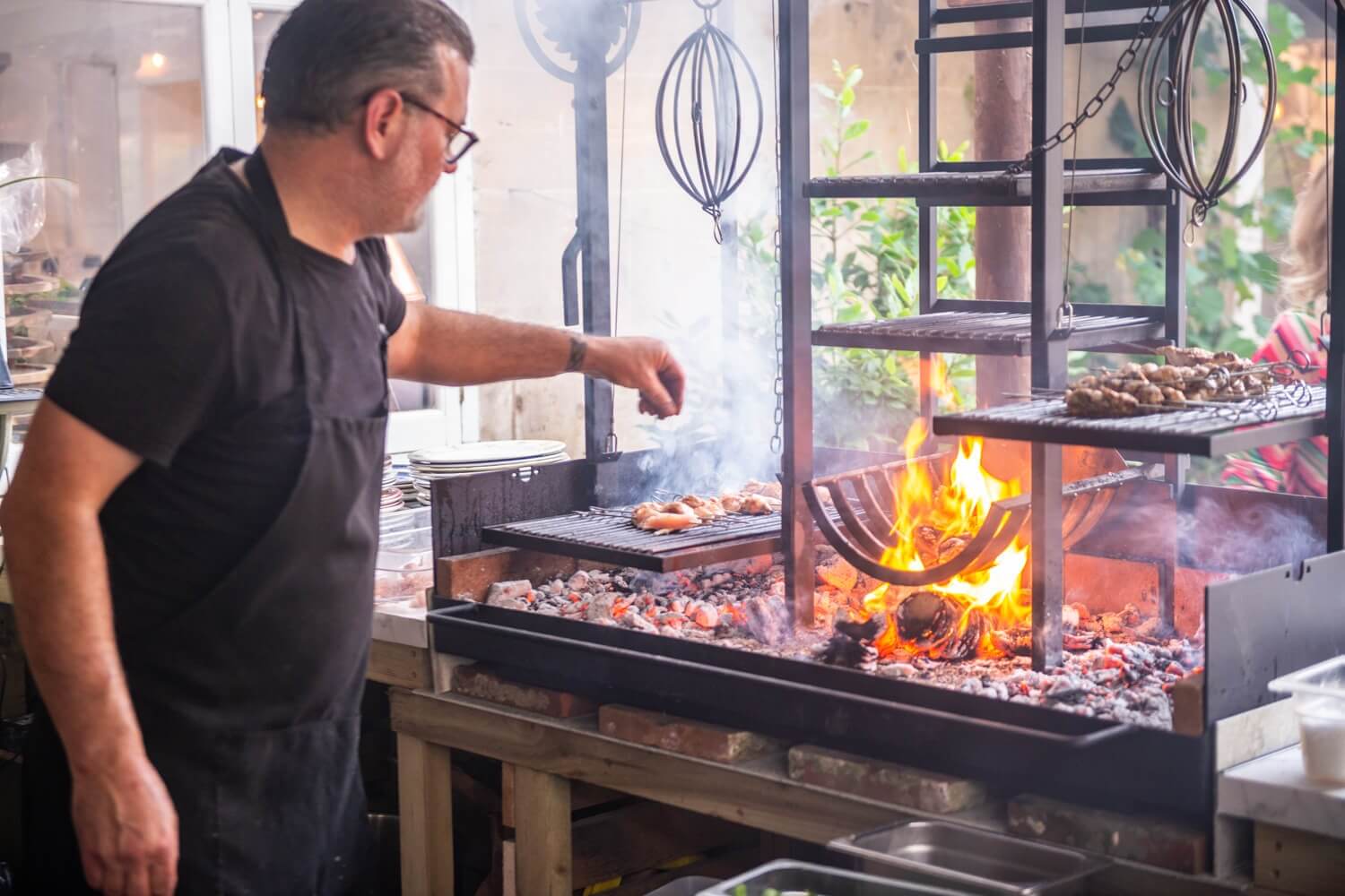 Chef grilling skewers over an open flame grill with smoke rising in a rustic outdoor kitchen setting