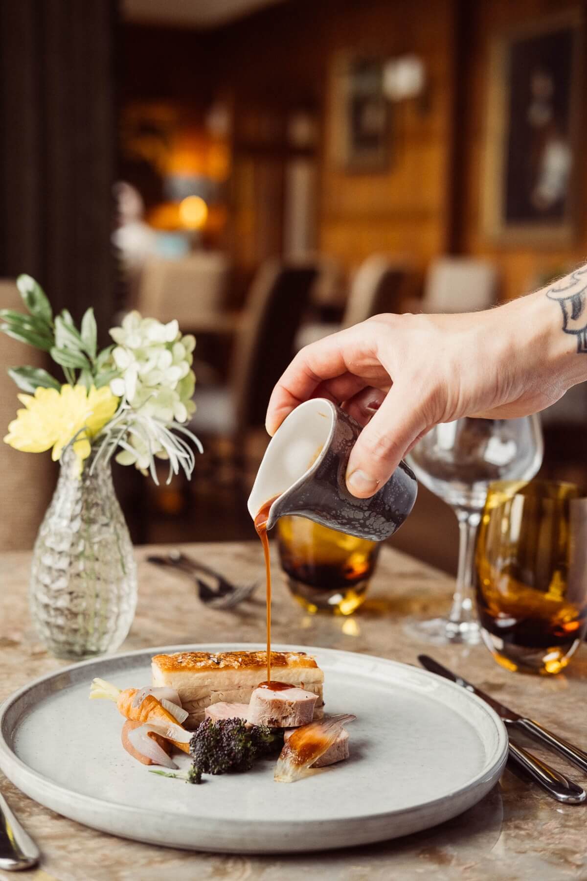 Hand pouring sauce over a plated gourmet pork dish with roasted vegetables in an elegant dining setting with glassware and fresh flowers
