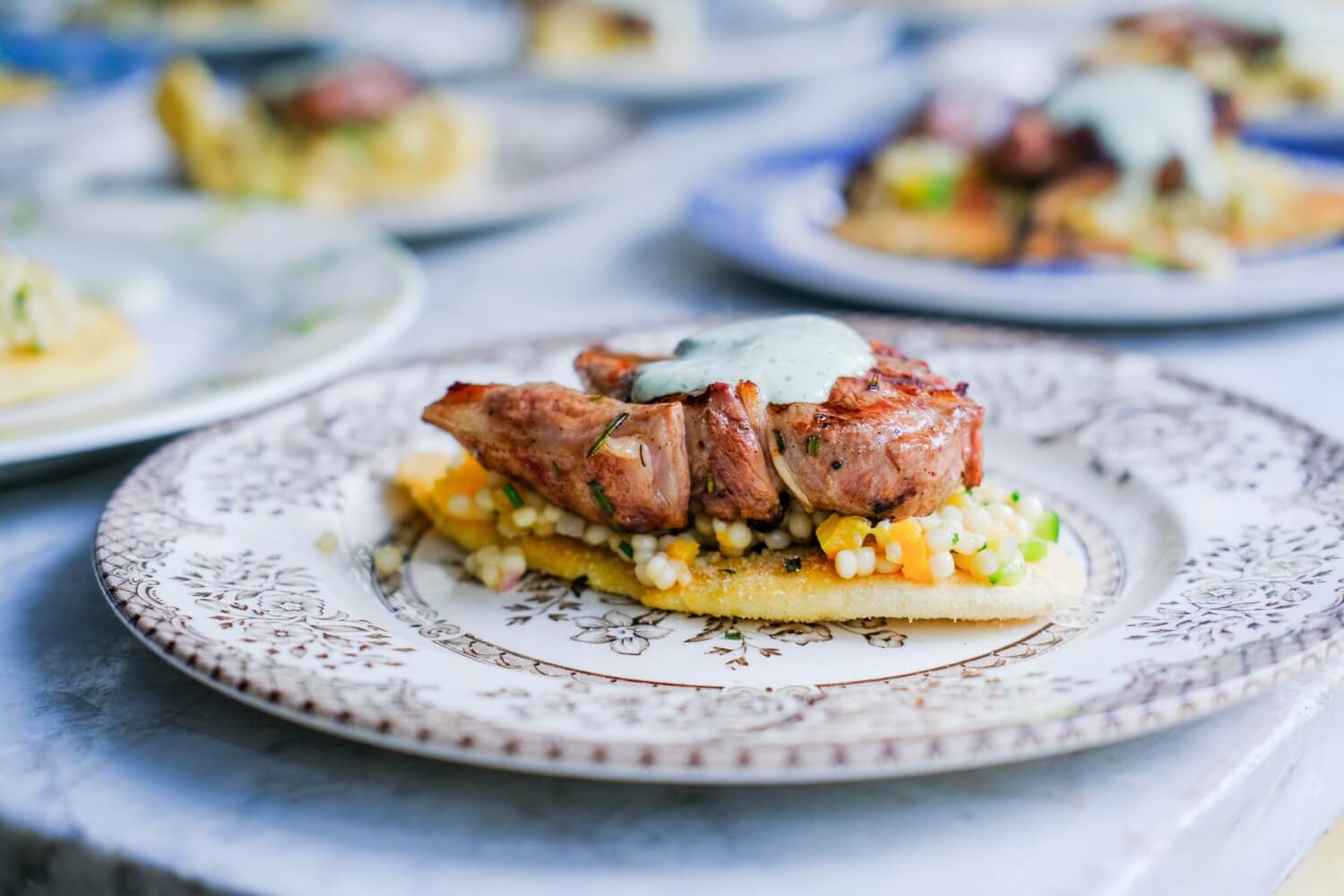 Grilled meat topped with herb sauce served on a bed of pearl couscous and vegetables on a decorative plate