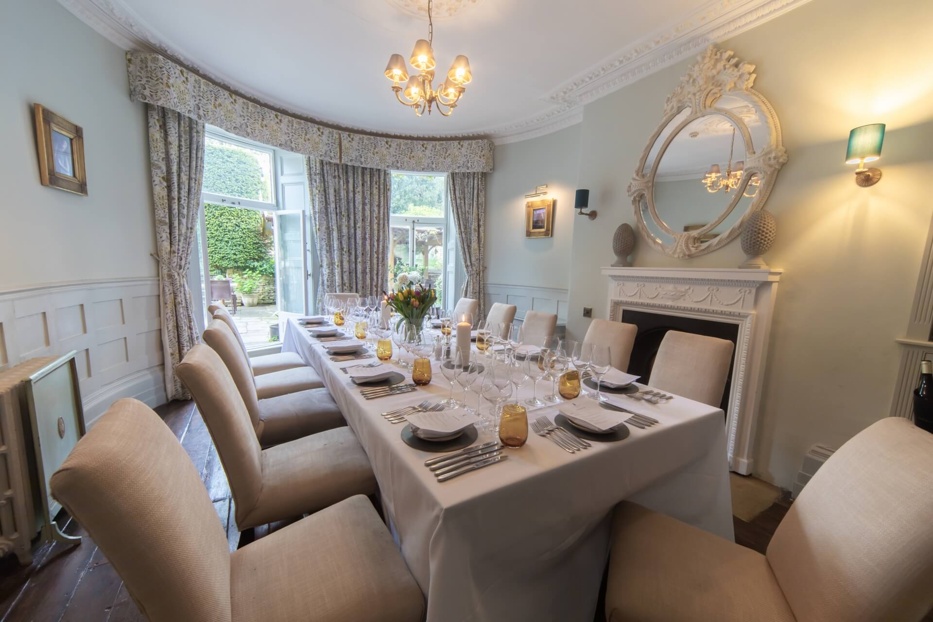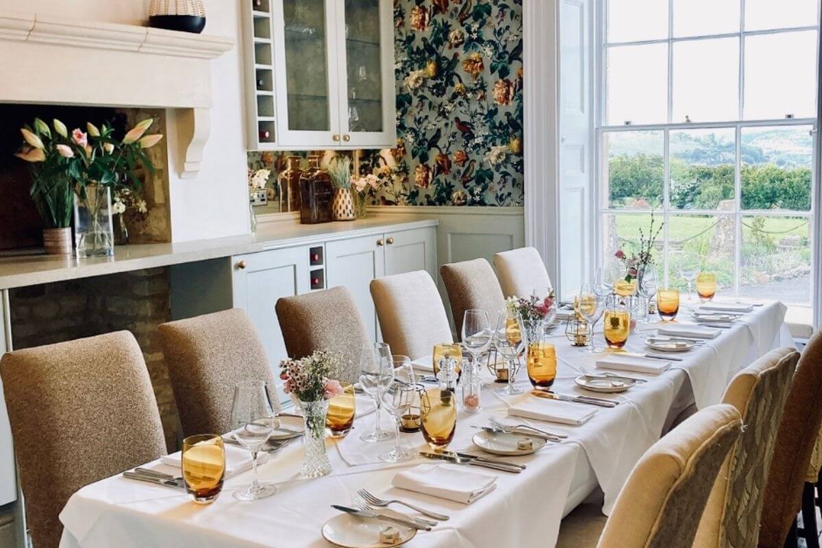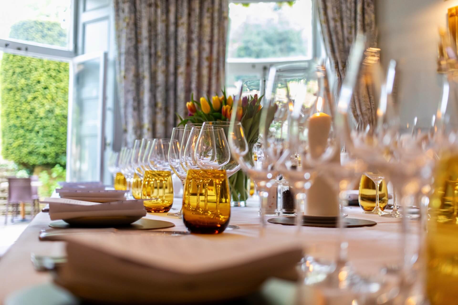 Elegant dining room with long table set for guests, amber glassware, floral centerpieces, cozy chairs, and large window overlooking green landscape