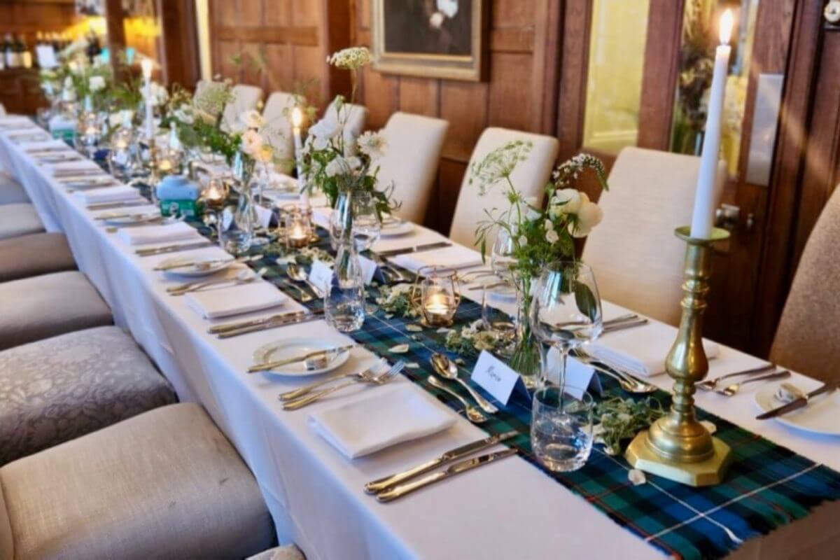 Elegant dining table set with white linens, glassware, fresh floral arrangements, and brass candlesticks in a wood-paneled room