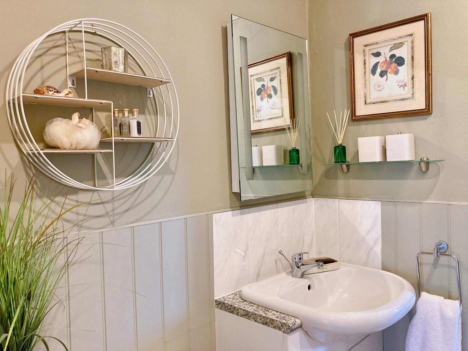 Bright bathroom with white sink, granite countertop, round wall shelf with toiletries, floral artwork, and a hand towel