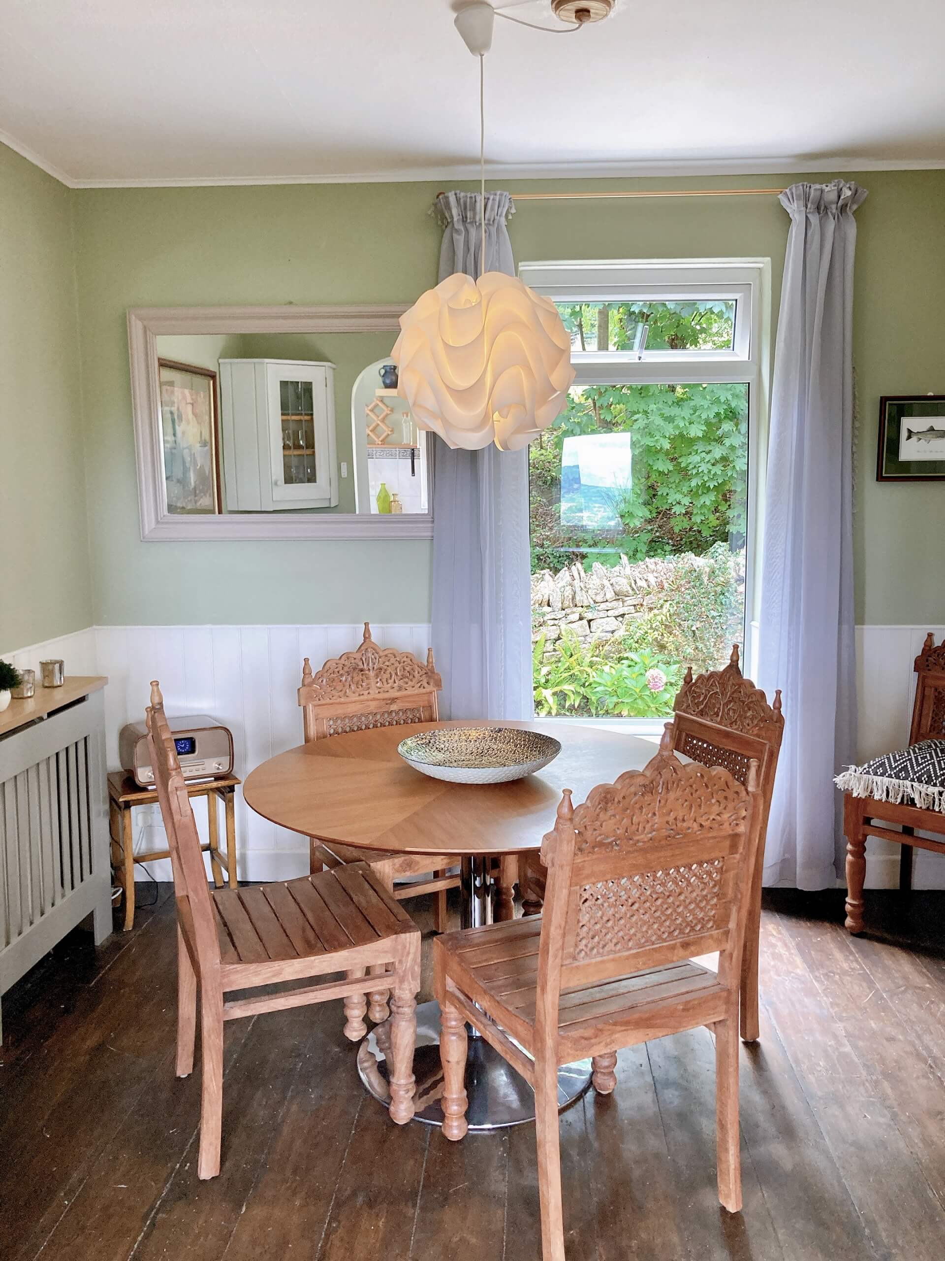 Cozy dining area with round wooden table, carved wooden chairs, soft green walls, decorative pendant light, and garden view through window