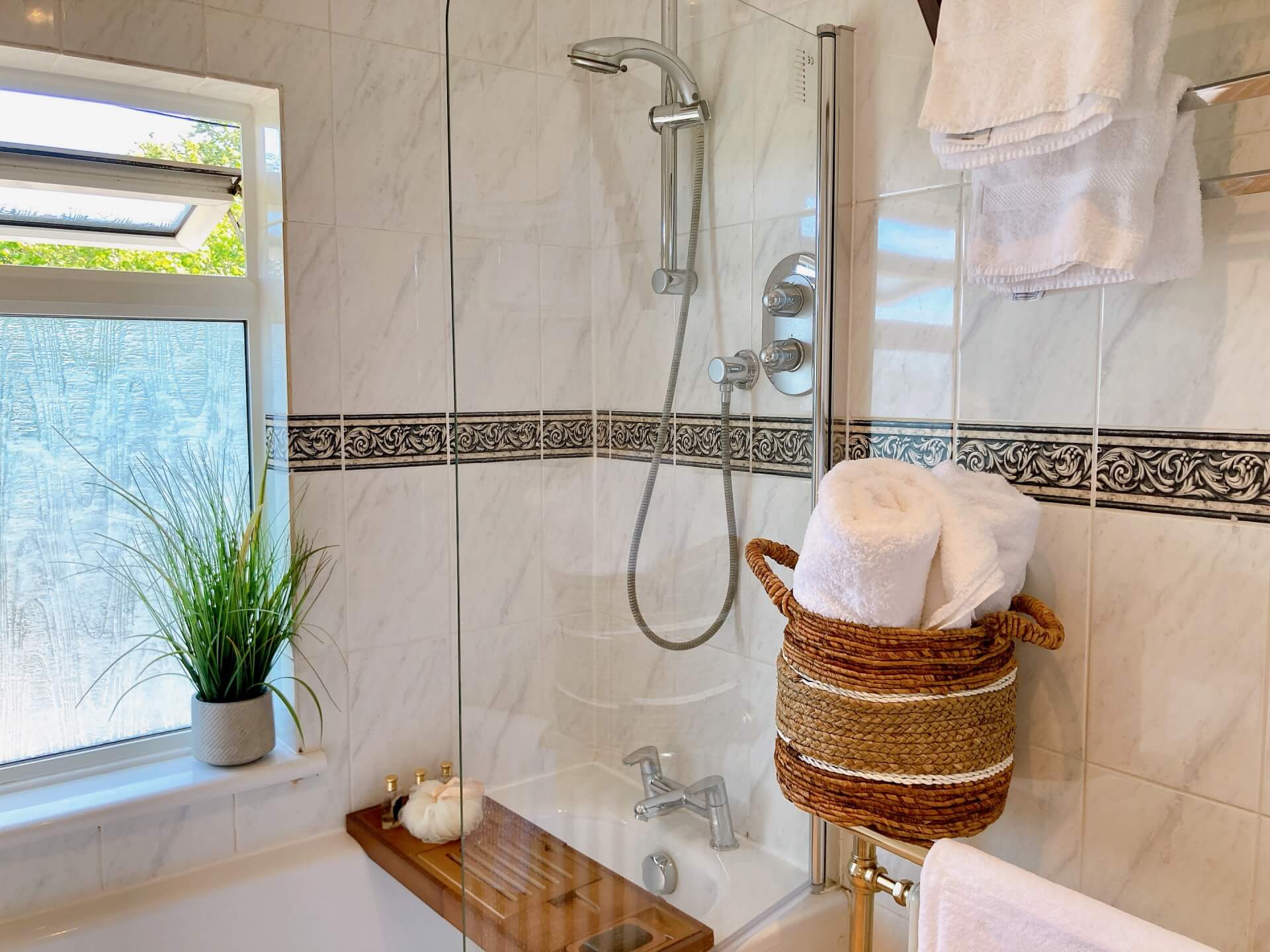 Bright hotel bathroom with marble tiles, walk-in shower, glass partition, rolled white towels in woven basket, and decorative plant by frosted window