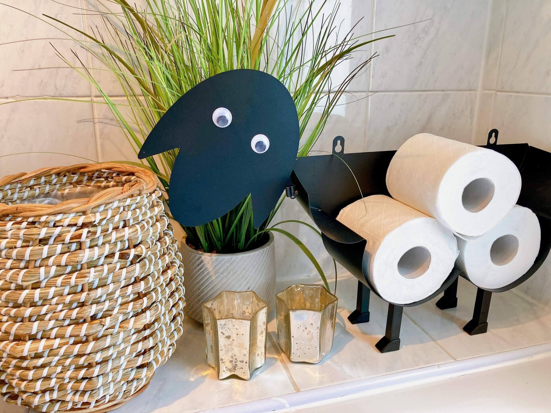 Bathroom shelf with rolled white toilet paper in black holder shaped like a sheep, green plant in textured pot, two small candle holders, and woven basket