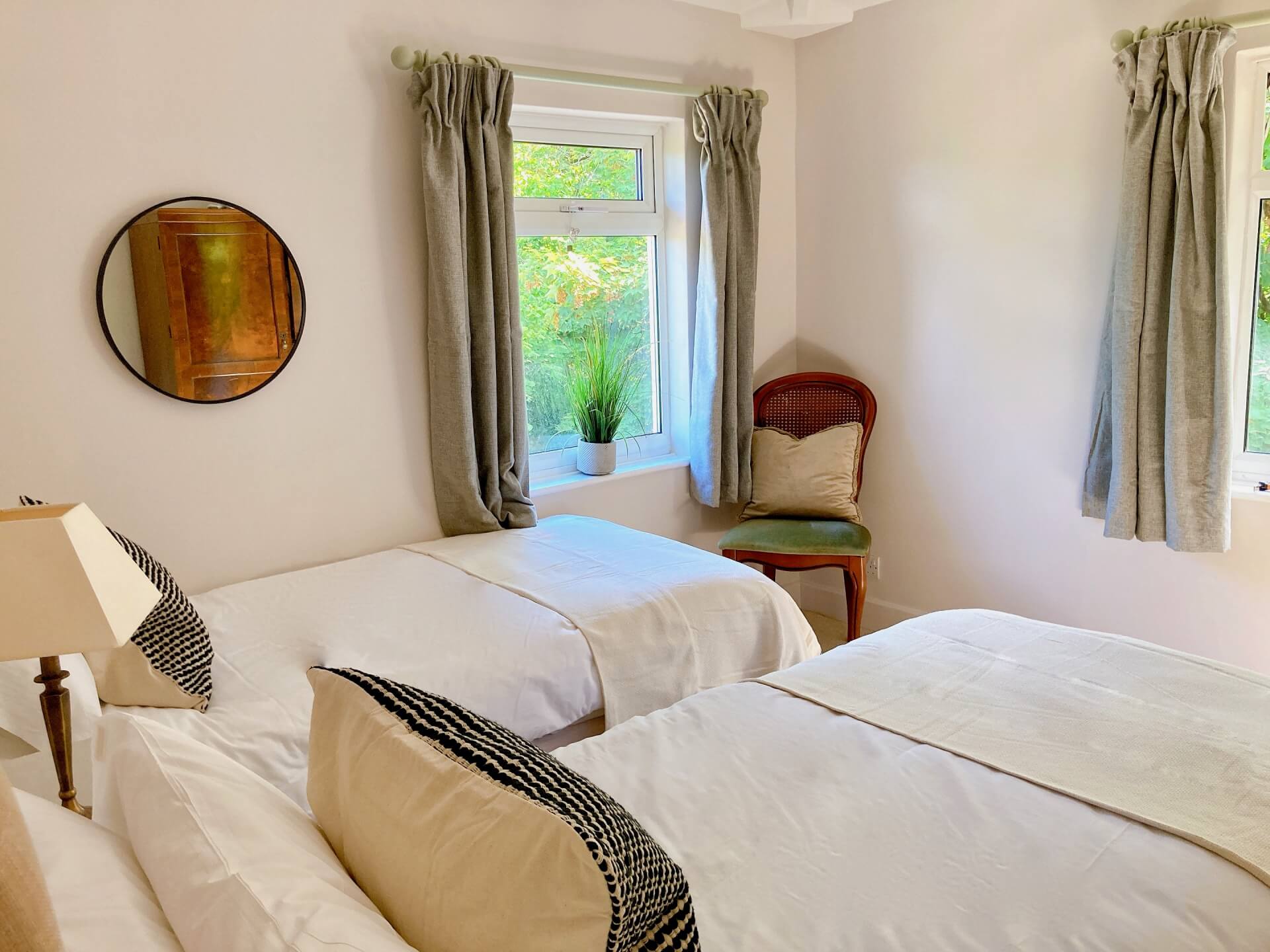 Bright twin bedroom featuring white bedding, patterned pillows, green cushioned chair, round wall mirror, and windows with beige curtains overlooking greenery