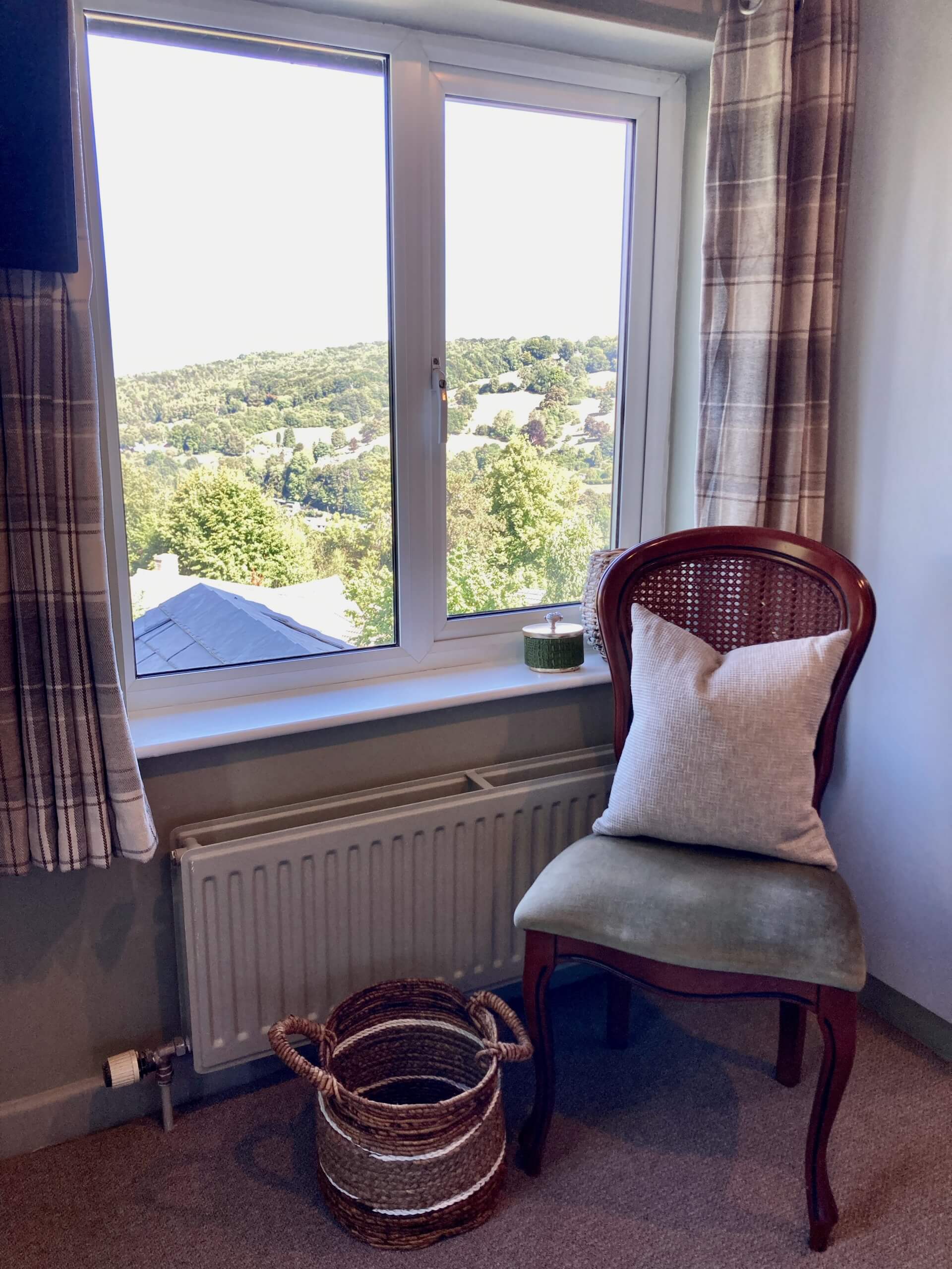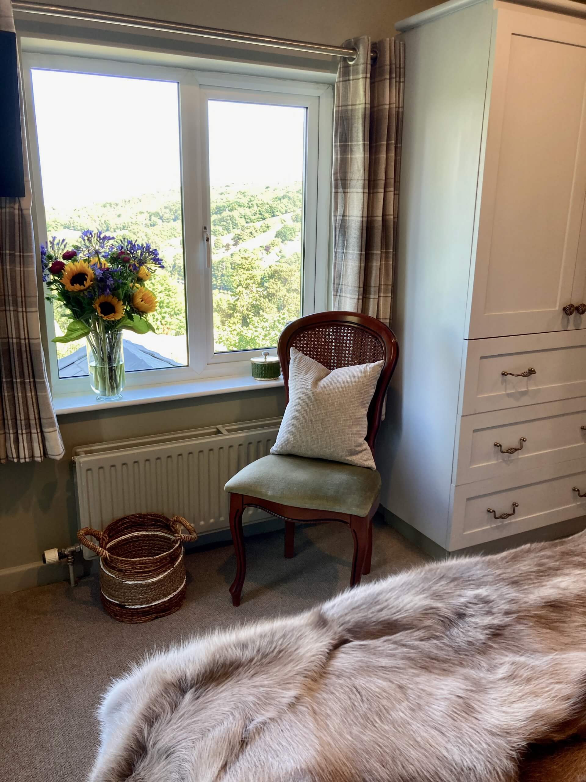 Cozy corner with cushioned wooden chair, woven basket, window with plaid curtains, and scenic view of green hills outside