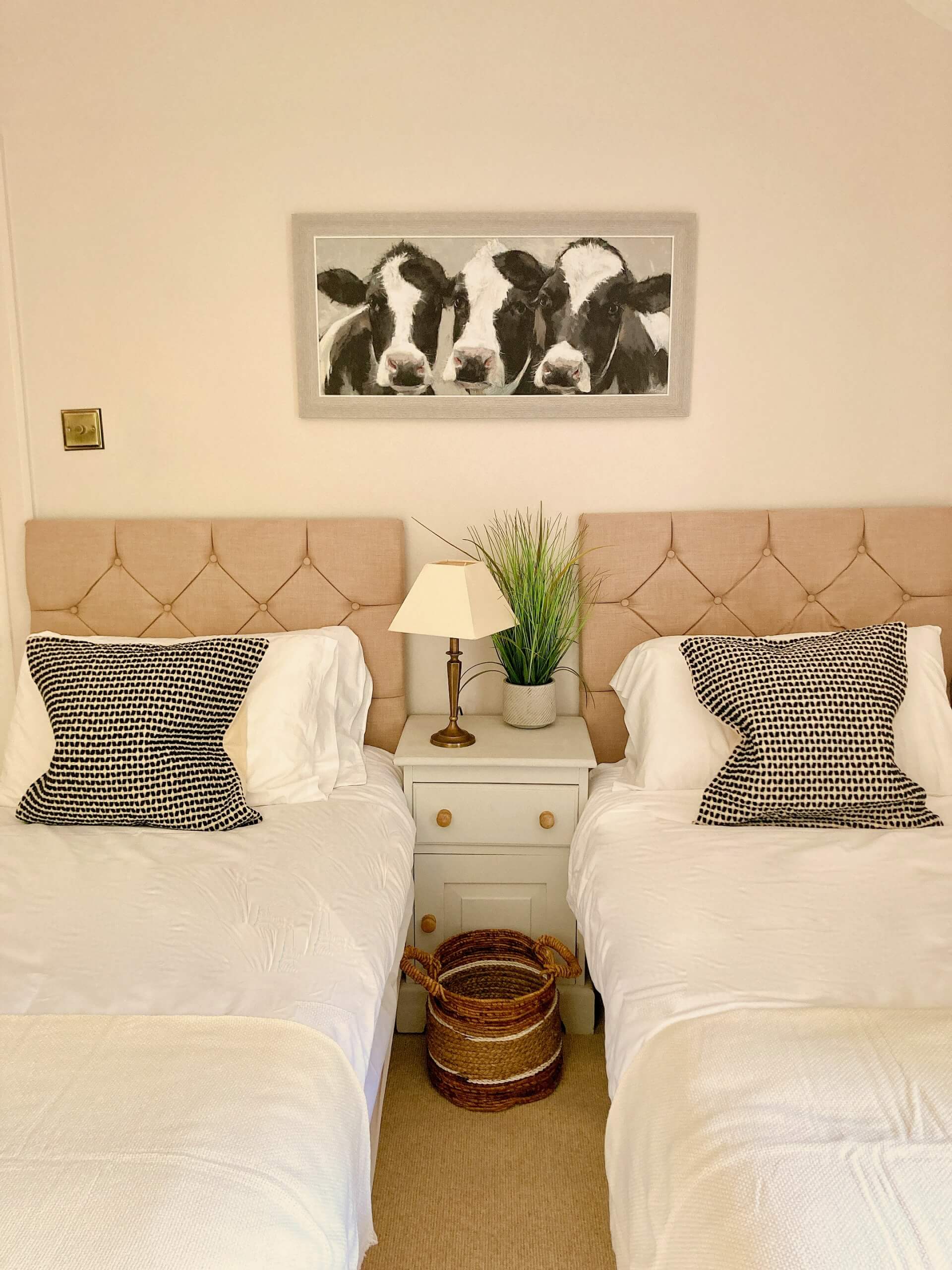 Cozy twin bedroom with beige tufted headboards, patterned pillows, white linens, bedside table with lamp and green plant, cow painting above