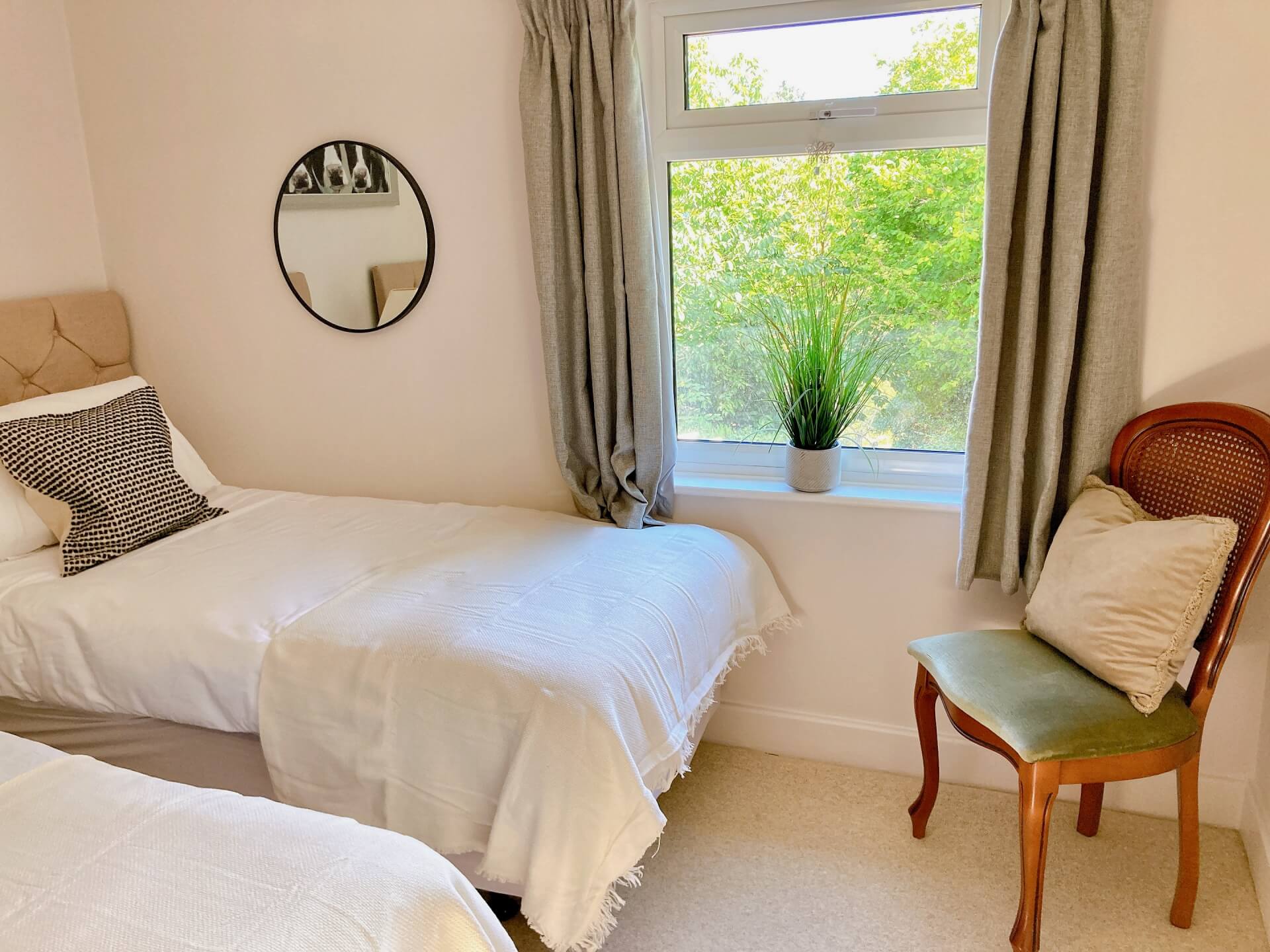 Cozy twin bed room with neutral decor, round wall mirror, window overlooking greenery, and wooden chair with cushion