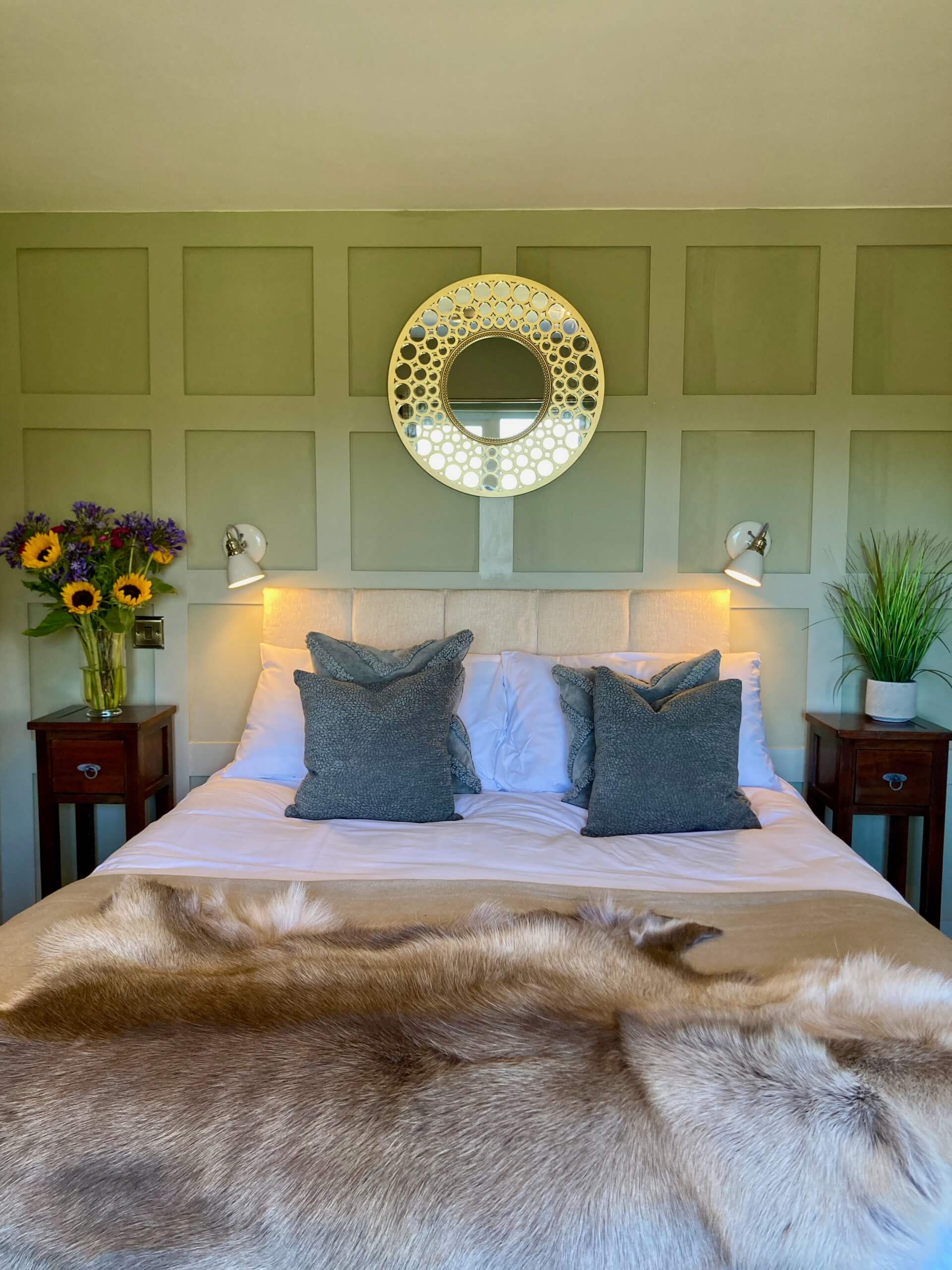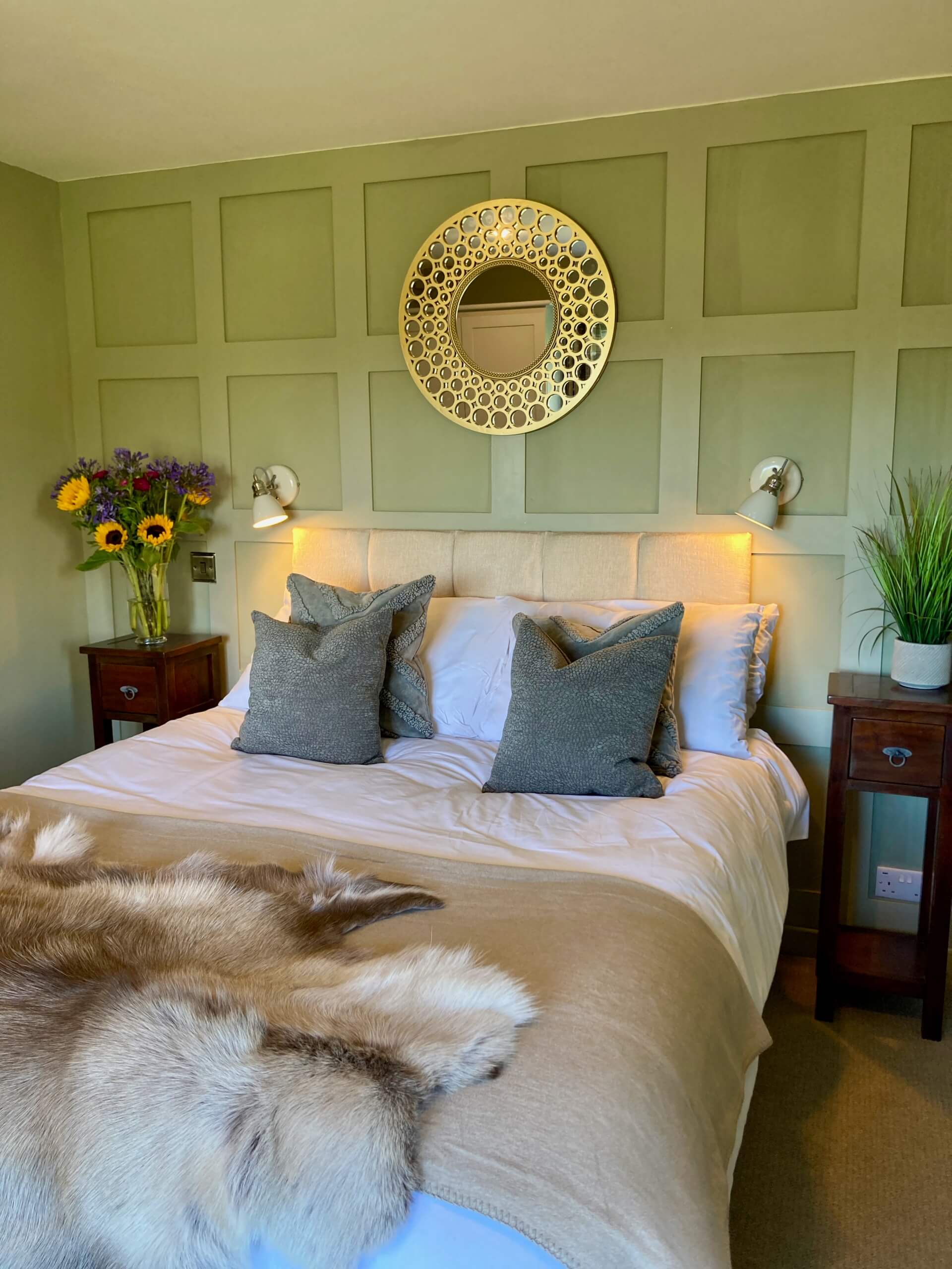 Cozy bedroom with a soft beige bedspread, gray pillows, fur throw, paneled green walls, floral vase, and decorative round mirror