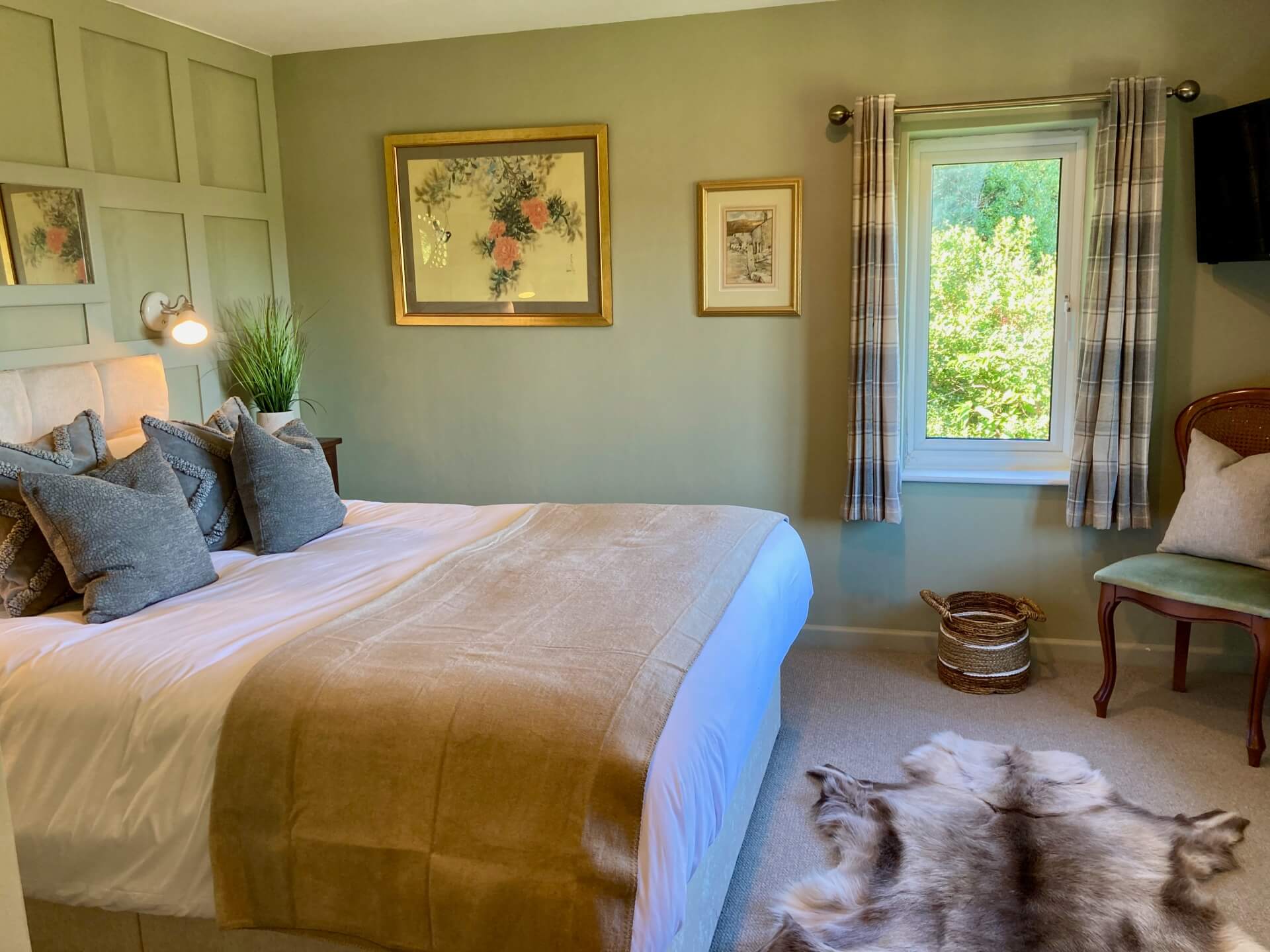 Cozy hotel bedroom with paneled green wall, white and gray bedding, fur throw, bedside lamps, fresh flowers, and potted plant