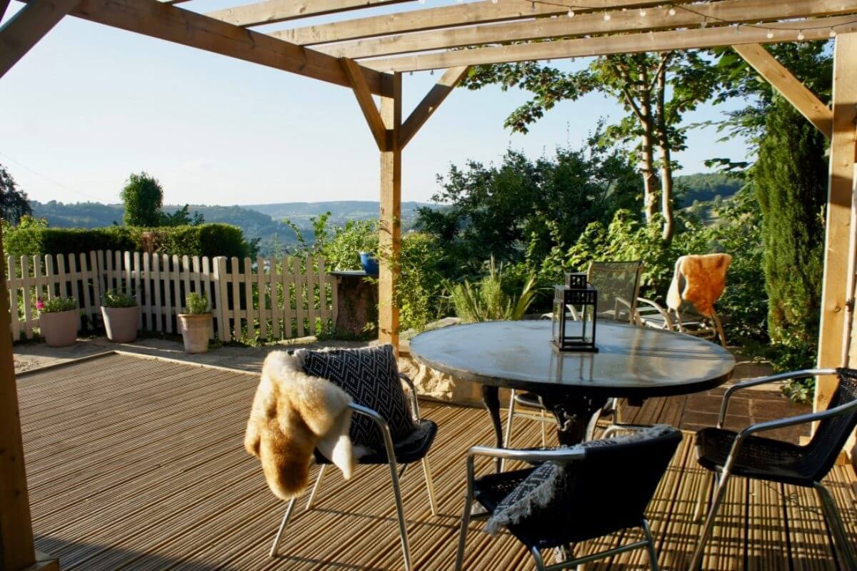 Sunny wooden terrace with round table, metal chairs draped with cozy throws, overlooking lush green hills and garden plants