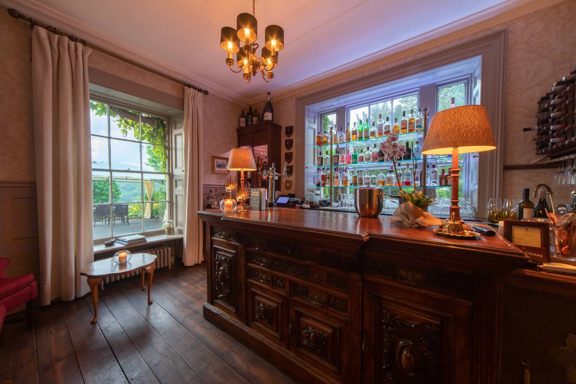 Cozy hotel bar with ornate wooden counter, shelves of liquor bottles by large windows overlooking a green outdoor terrace