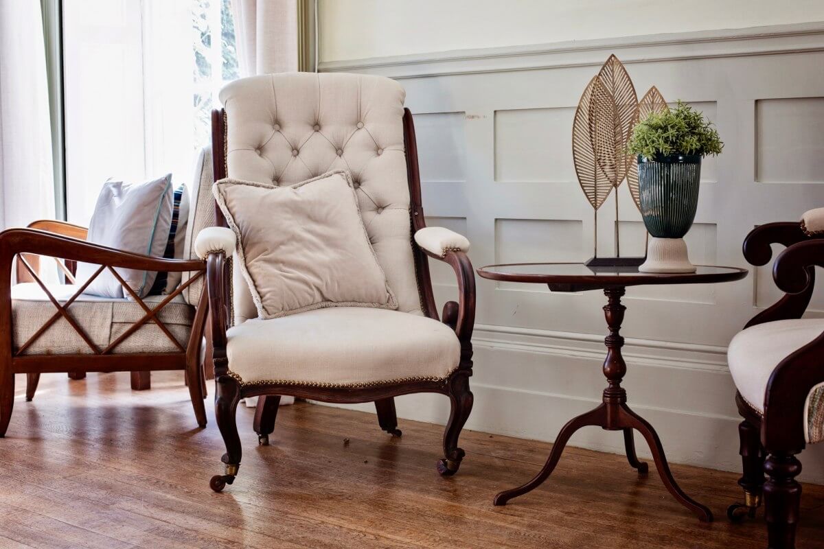 Cozy seating area with vintage tufted armchair, wooden side table with decorative plant, and soft natural light in a classic lounge