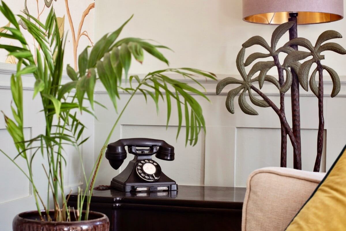 Cozy corner with vintage rotary phone on dark wooden table, tropical plant in ceramic pot, and palm-themed floor lamp by beige sofa
