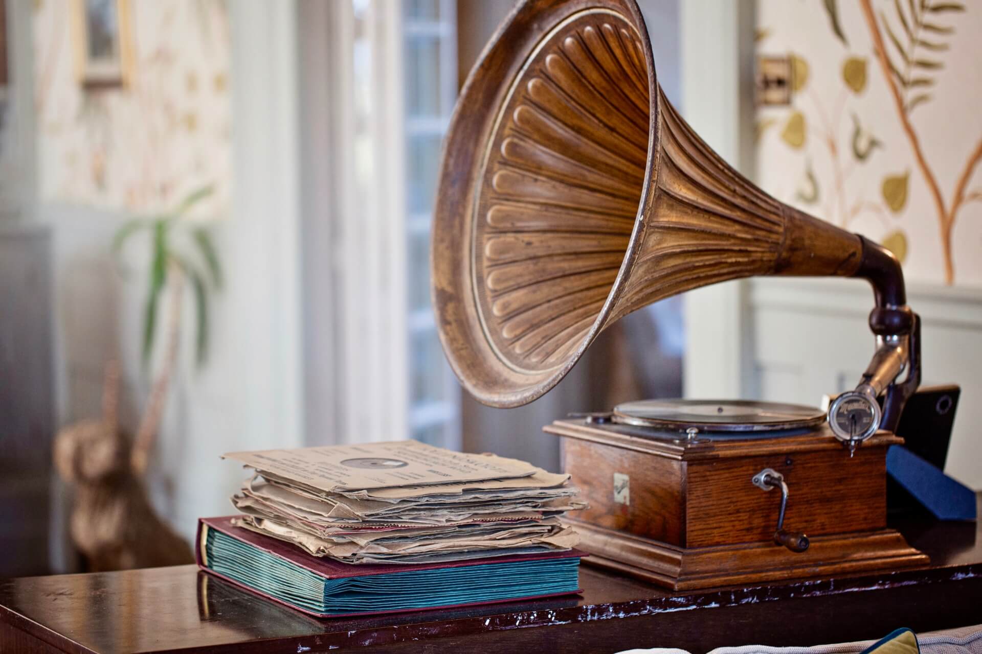 Vintage gramophone with a large brass horn and stacked old vinyl records on a polished wooden table in a cozy hotel lounge.