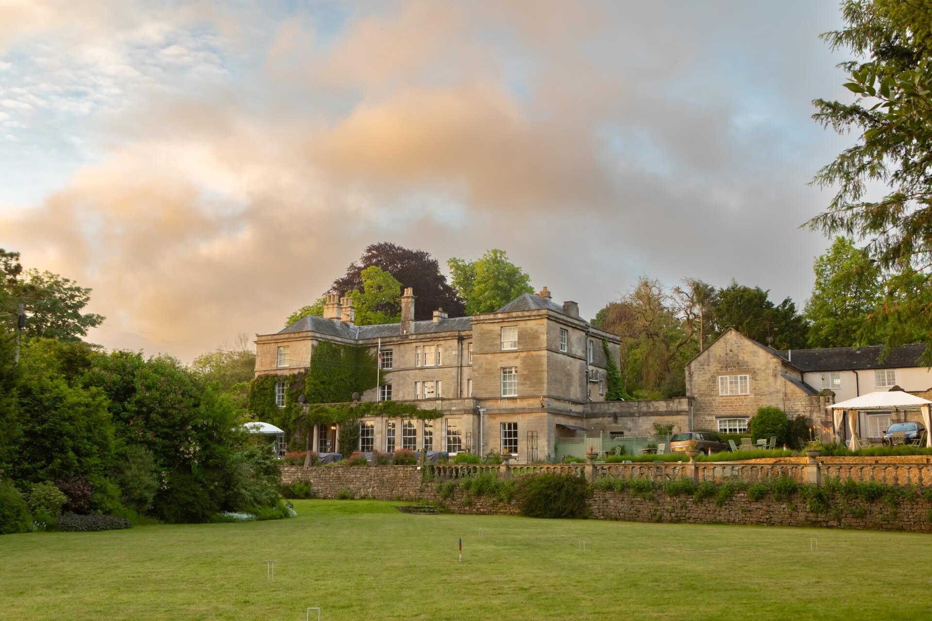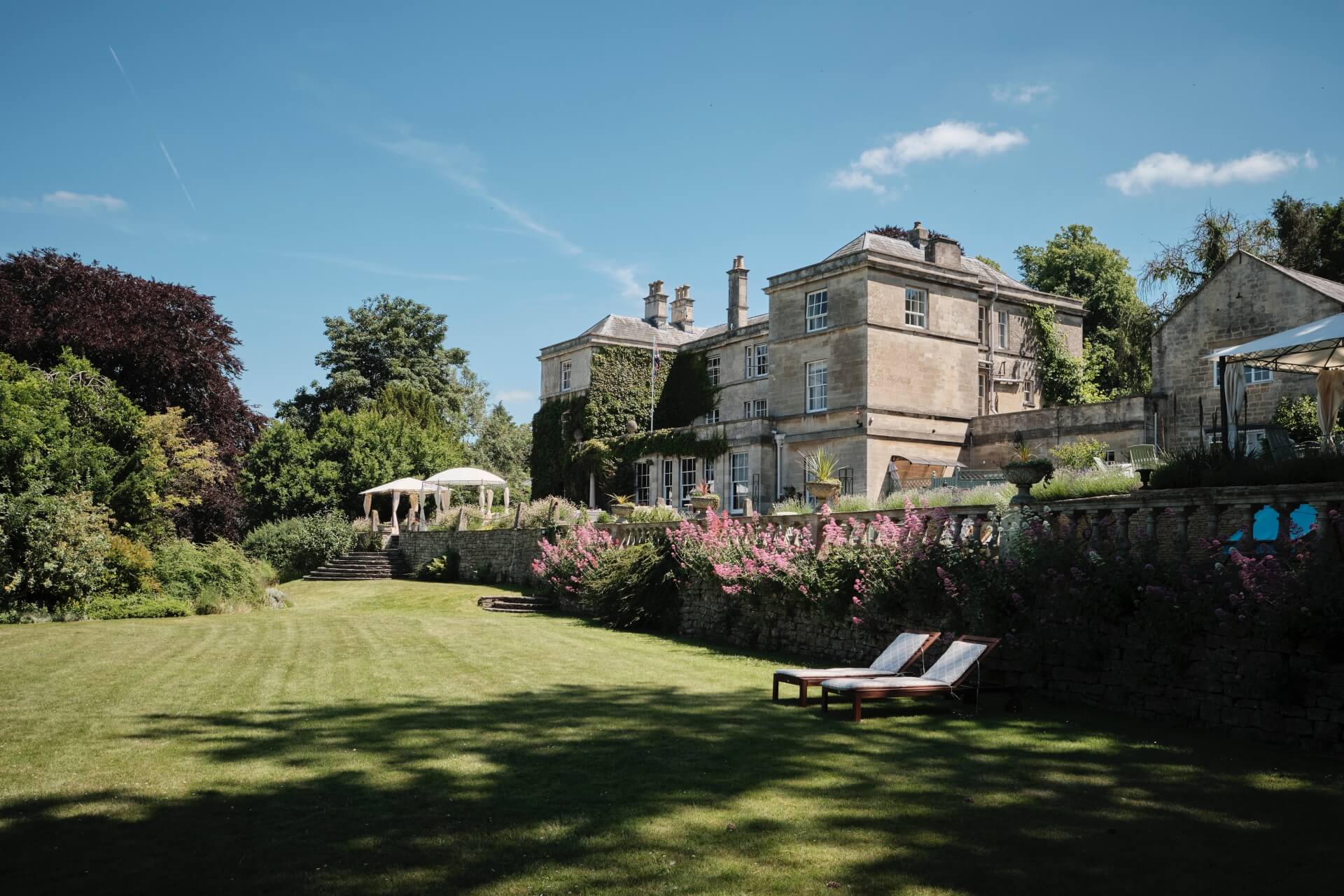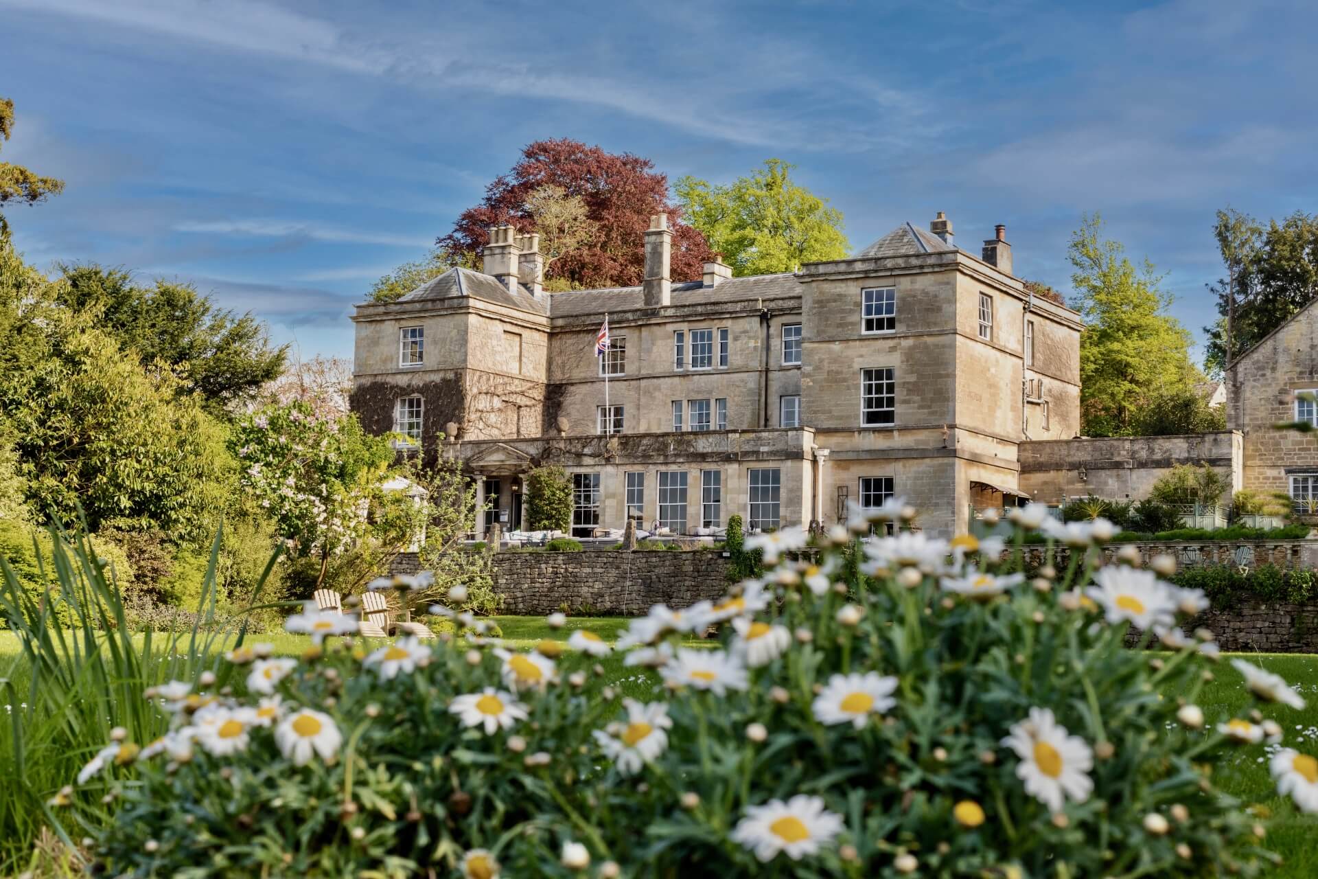Historic stone country house hotel surrounded by lush gardens and blooming daisies under a clear blue sky