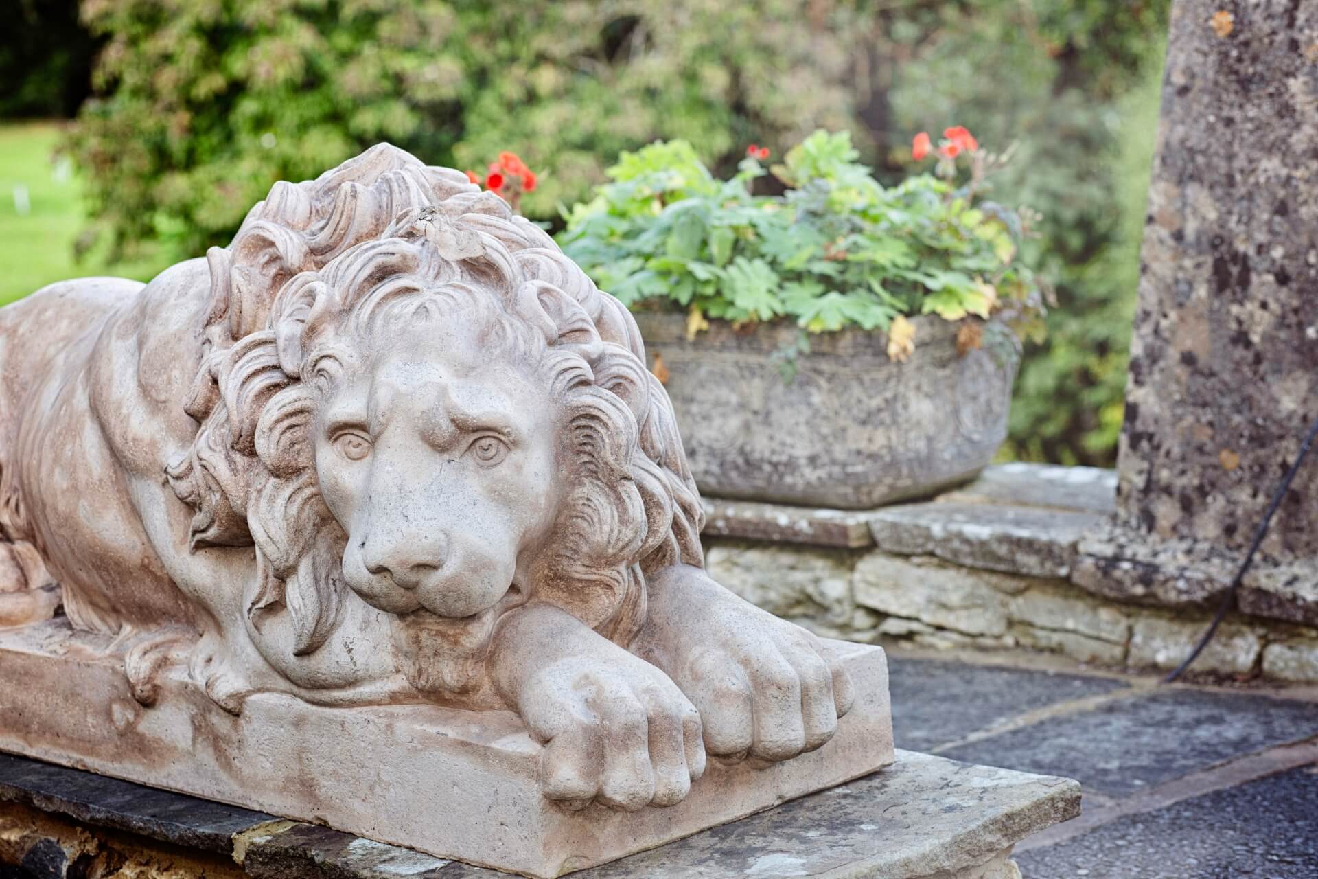 Detailed stone sculpture of a reclining lion in the hotel garden, near a stone planter with green and red flowers